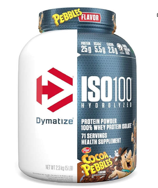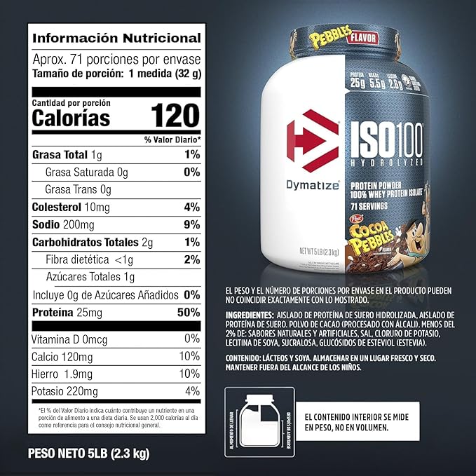 ISO 100 hydrolyzed de la marca Dymatize es un suplemento proteico derivado 100% de proteína de suero aislado. Cada porción de 31 g contiene 25 g de proteína, sólo 1 g de carbohidratos y menos de 1 g de azúcar. Además es baja en grasa y en colesterol. Es conocida mundialmente por su calidad, sabor y pureza.